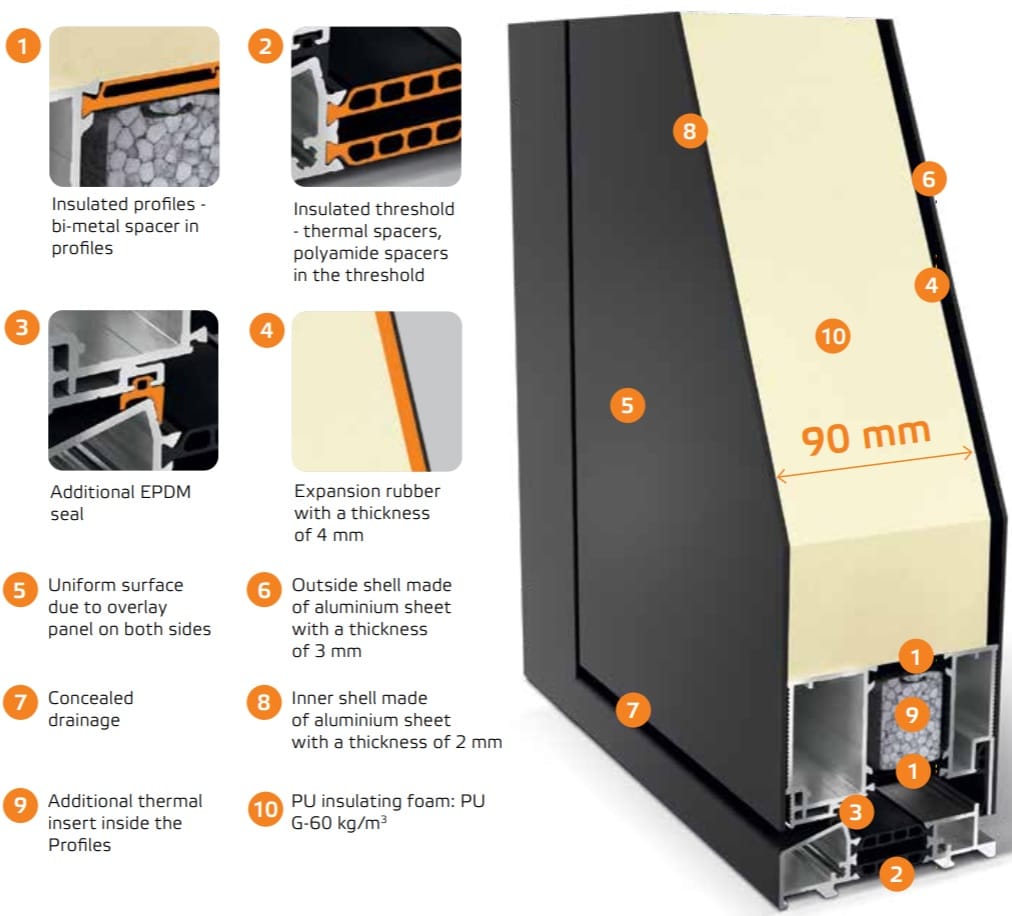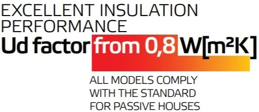 Das SOLANO-Aluminiumtorsystem basiert auf Sektionen, die in einer Tiefe von 90 mm montiert sind. Die Füllung des Systems besteht aus Paneelen aus Aluminiumblechen, die mit einer sehr dicken Schicht isolierenden Polyurethanschaums gefüllt sind. Die Paneele überlagern sich auf beiden Seiten des Tores, so dass eine optisch ansprechende Oberfläche entsteht, die mit dem Rahmen übereinstimmt. Die Designer der Türen haben sich auf jedes konstruktive Detail konzentriert, um einen Wärmedurchgangskoeffizienten von 0,8 W [m2K] zu erreichen.