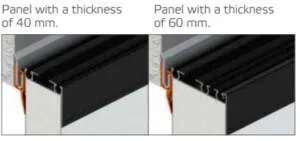 Our sectional doors have one of the best thermo-insulation properties in the market: U=1,12 [W/m2K]*, and it is only U=0,9 [W/m²K]* for the warm doors VENTE K2 RFS 60. The doors are made of panels 40 or 60 mm thick and they are filled in with polyurethane foam and sealed along the whole perimeter and between the sections. We have also added two ‘lips’ at the bottom sealing between the panels and the ground.