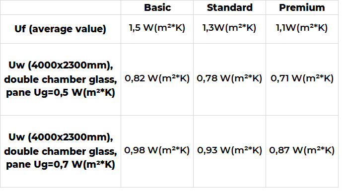 | Uf value | energy performance | 1,2 | 1,2 | 0,98 | 1,0 | - |