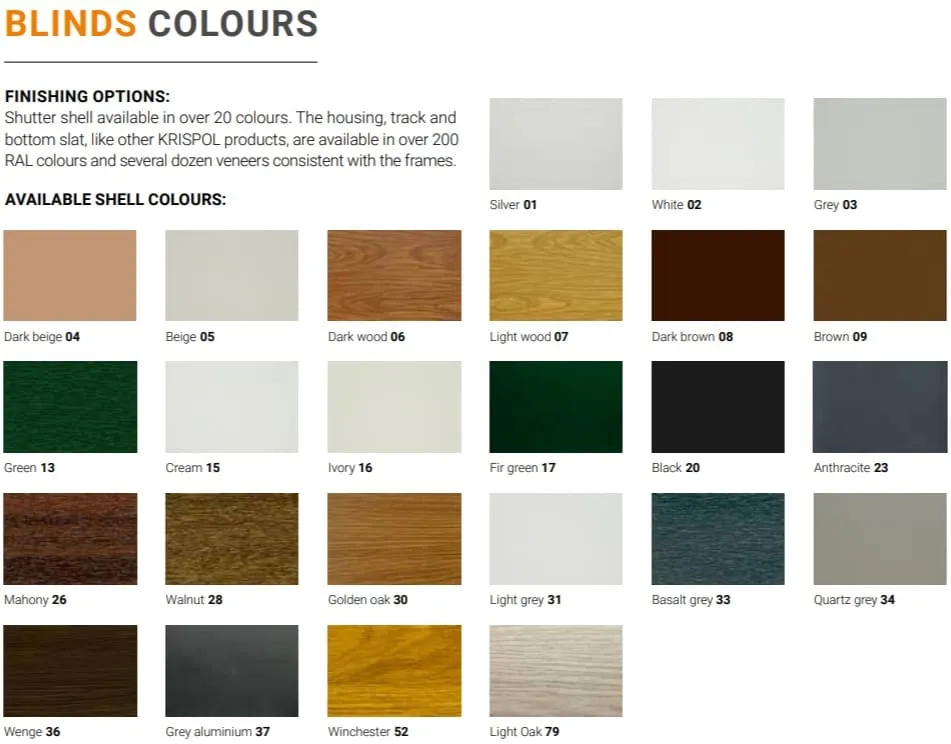 Eine riesige Palette an Farben und Gestaltungsmöglichkeiten ermöglicht es Ihnen, alle Elemente der Rahmen nach Ihrem eigenen Geschmack zu gestalten, auch die Farben der Jalousien und Rollläden.