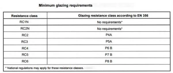 Wenn mehrere Glasscheiben in einem Produkt, einschließlich Fenstern oder Türen, z. B. Isolierglas, verwendet werden, dann sollte mindestens eine der Glasscheiben die Anforderungen für eine bestimmte Einbruchhemmungsklasse erfüllen, wie in Tabelle 1 aufgeführt. Die Widerstandsklassen von Verglasungen werden auf der Grundlage der Bestimmungen der Norm EN 356 „Glas im Bauwesen. Schutzverglasungen. Prüfung und Klassifizierung der Widerstandsfähigkeit gegen manuellen Angriff“.